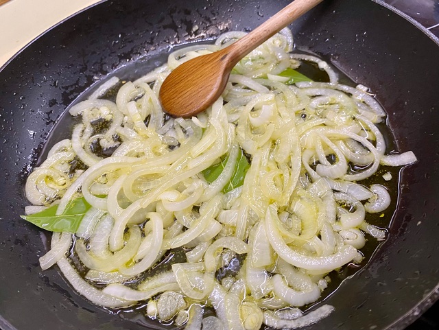 - Zwiebeln und Lorbeerblätter bei mittlerer Hitze in Olivenöl ca. 15 min. dünsten.
