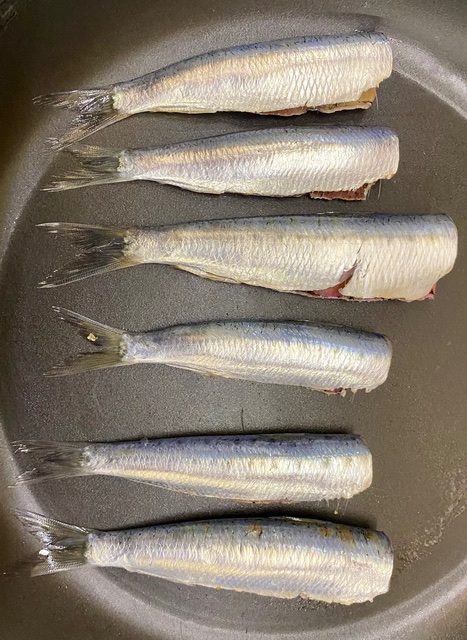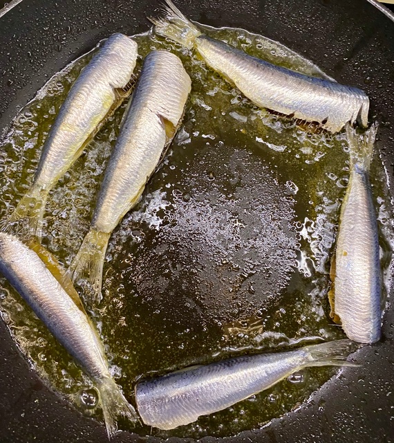 - Das Öl auf mittlerer Stufe erhitzen und die Sardinen 2 Minuten braten, Deckel draufgeben und nochmals 2 min. weiterbraten, NICHT LANGER.