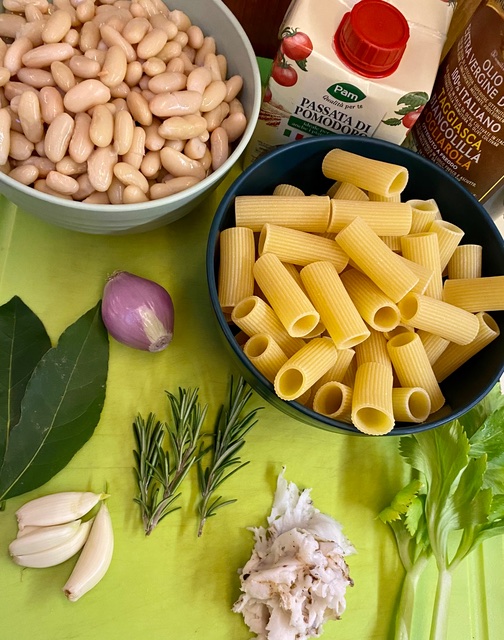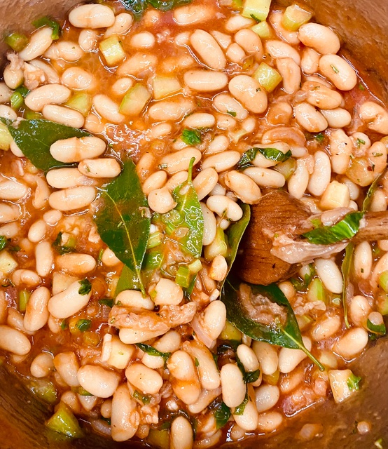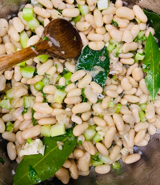 Wenn man getrocknete Bohnen verwendet, werden diese am Tag zuvor in reichlich Wasser aufgeweicht. Danach werden die Bohnen auch in diesem Wasser mit Knoblauch und Lorbeer gekocht bevor das alles in den Topf zu den Zwiebeln etc. dazukommt.