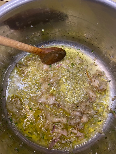 - Den Lardo mit Rosemarin und einem guten Schuss Olivenöl anbraten und die Zwiebel hinzufügen.