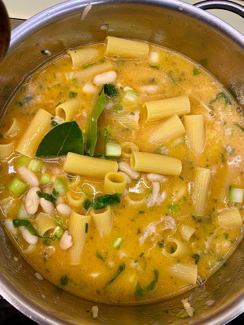 - Nachdem die weißen Bohnen dazugegeben wurden mit 1,5l Wasser ablöschen. (Bei frischen Nudeln ca. 1/5l Wasser)